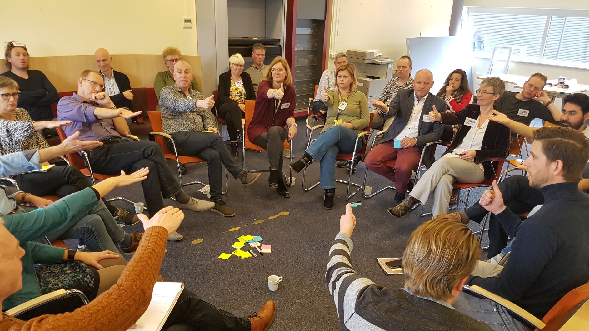 Van de bijna 100 collega’s bleken er in totaal 42 te zijn die tot het einde betrokken wilden zijn bij het besluit. Bijna de helft van de organisatie dus. Omdat consent besluitvorming met een grote groep van 42 best moeilijk is, maar we wel ieders stem wilde horen organiseerden we vier deelsessies met 10 – 12 deelnemers. Iedere groep nam een ‘in principe’ besluit, wetende dat andere groepen ook zo’n besluit te nemen hadden en we de uitkomsten nog bij elkaar moesten voegen. Ieder van deze vier groepen had de mogelijkheid om een gedelegeerde te kiezen als vertegenwoordiger, om samen met het management en bestuurder in een eindsessie het definitieve besluit te nemen waarin alle bezwaren zijn verwerkt.