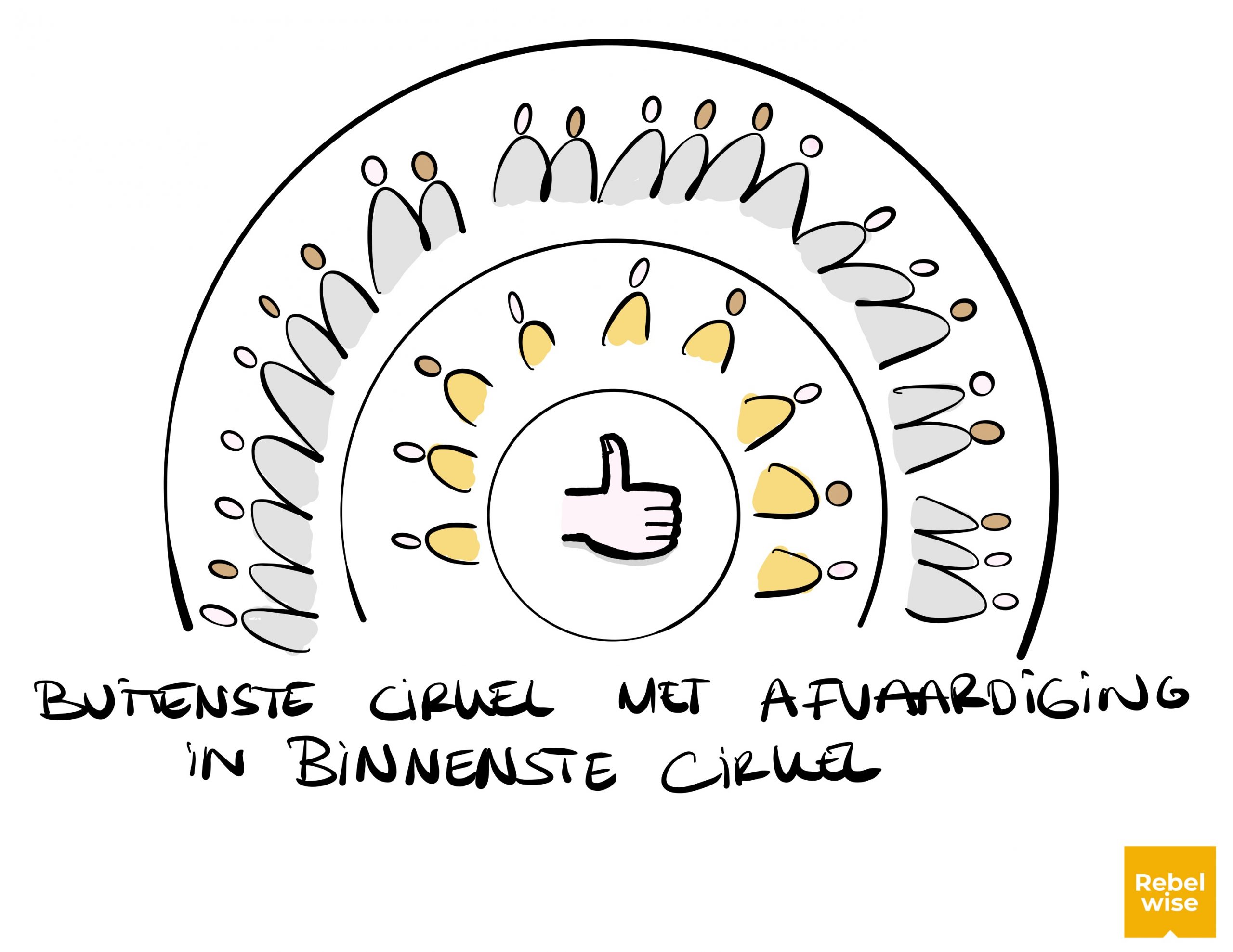 Hoewel in de deelsessies iedere stem gehoord is en er een vertegenwoordiger plaatsneemt in de groep die de eindbeslissing neemt, boden we de mogelijkheid voor een ‘publieke tribune’. Voor UWOON heeft dit besluit namelijk twee doelen: een optimaal huisvestingsplan en een optimale kennismaking met consent besluitvorming. We werkten daarom met een binnenste ring (actief betrokken bij het besluit) en een buitenste ring (actieve toeschouwers). De buitenste ring participeert alleen wanneer er bezwaren zijn die door de binnenste niet gezien worden. Het zou immers zonde zijn als we hun inzichten niet direct mee zouden nemen aangezien het mogelijk tientallen duizenden euro’s kan schelen als we achteraf herstelwerk moeten doen.