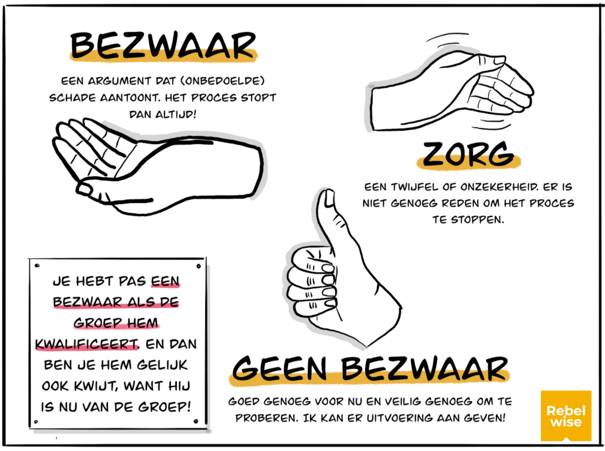 Voor het uiten van bezwaren maken we gebruiken van handgebaren tijdens een stemronde: duim omhoog is ‘Ik heb geen bezwaar en kan uitvoering geven aan het voorstel’. Hand open, palm naar beneden is ‘ik heb zorgen, maar geen bezwaar’ en houdt het voorstel dus niet tegen. De hand open, palm omhoog is ‘ik zie een bezwaar om verder te gaan met deze driver’. Deze wijsheid willen we graag benutten en toevoegen aan het voorstel, na een check bij de groep of dit inderdaad een valide argument is.